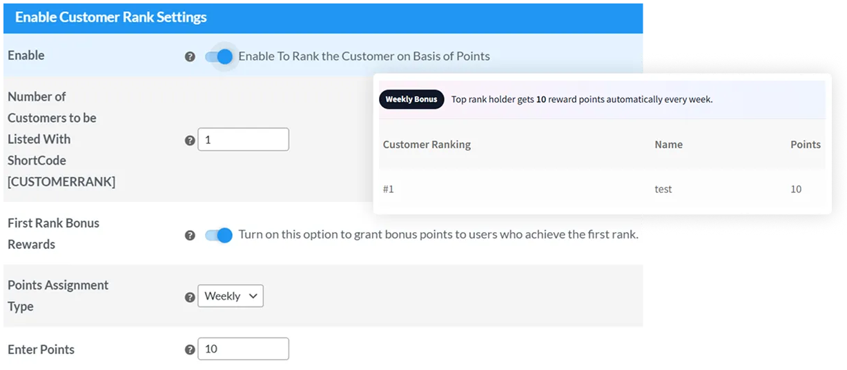WooCommerce store owners can now reward the customers with the highest rank. Merchants can assign extra points to reward the top-ranked customer (every week or every month). They can set the frequency as per their preference.